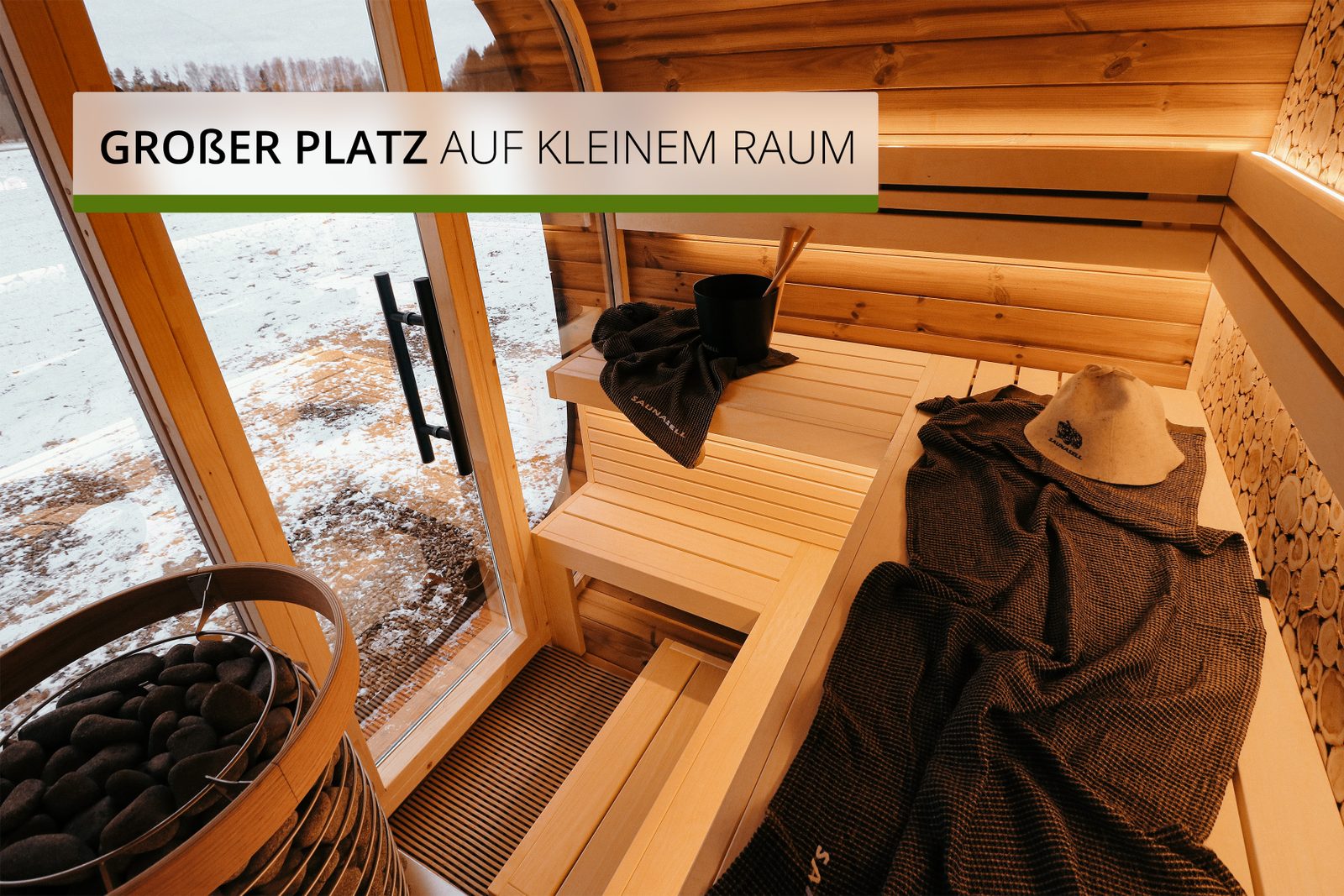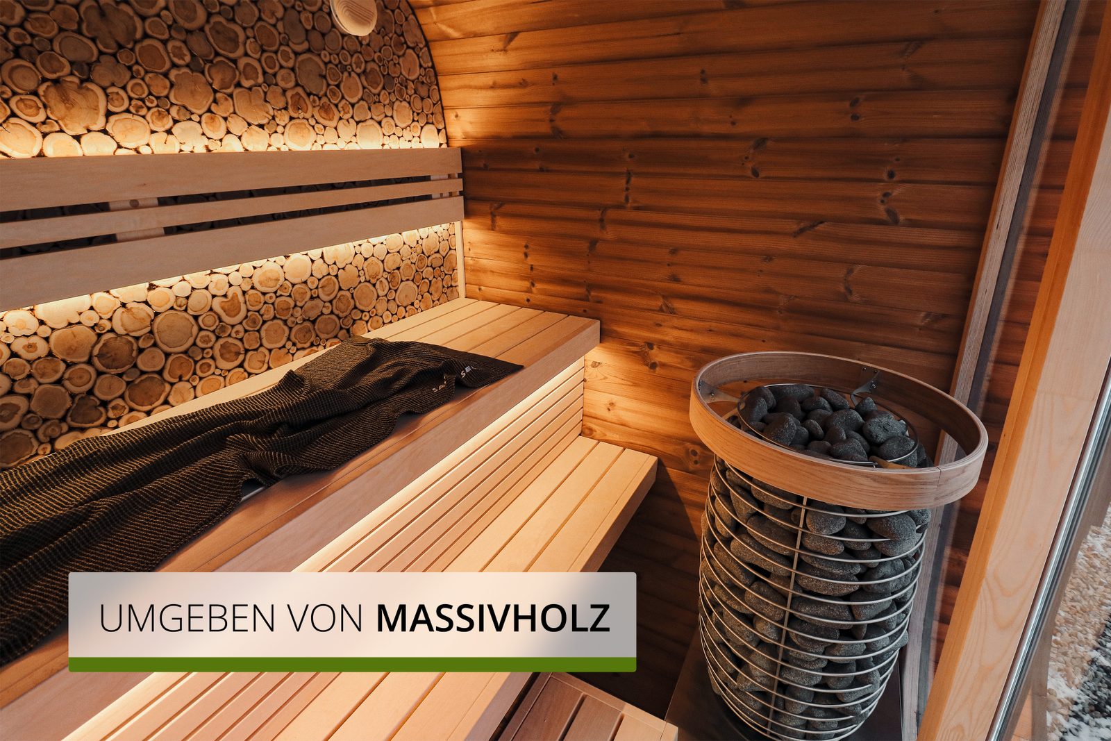 Wärmegefühl wie in echter Finnland-Sauna: wie das traditionelle finnische Saunahaus besteht die Round Cube Sauna aus massiven Bohlen. Im Gegensatz zu dünnen Paneelen speichern die massiven Holzwände Wärme und sorgen durch ihre langsame Abgabe für das von Saunaprofis geschätzte, besonders angenehme Saunaklima.
